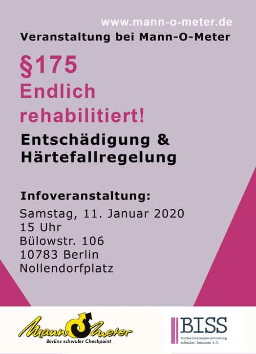 Bei dieser Infoveranstaltung berichtet Marcus Velke von der Bundesinteressenvertretung schwuler Senioren, über den aktuellen Stand der Rehabilitierung und Entschädigung betroffener Personen. Ein weiterer Gast ist Günter Werner, der Opfer des §175 wurde und vor gut einem Jahr eine Entschädigung erhalten hat. Er berichtet über seine Verurteilung und wie er seine Rehabilitierung und Entschädigung erlebt hat.
